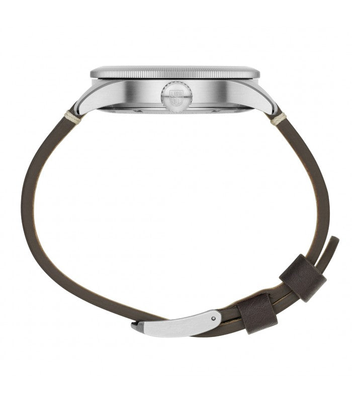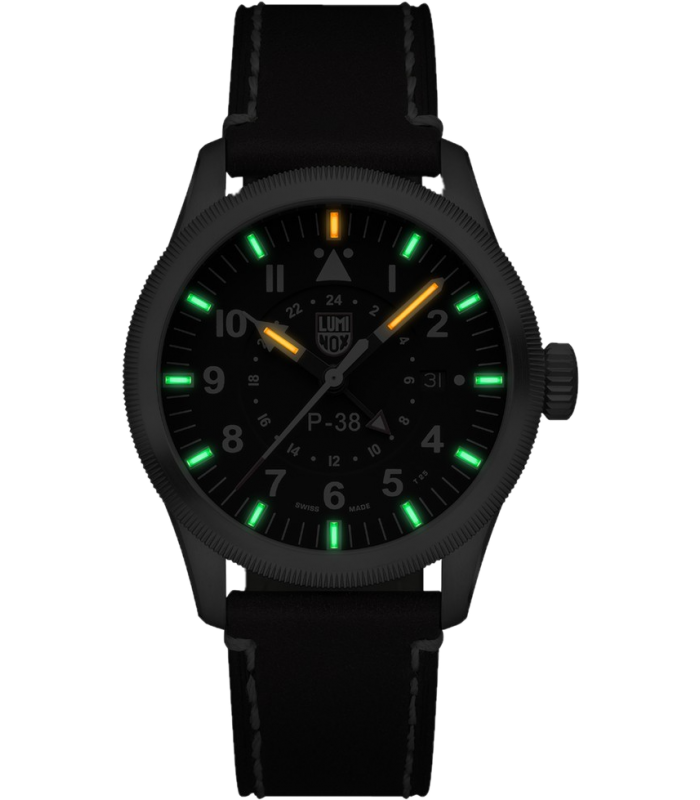 El atemporal P-38 LIGHTNING® con esfera negra de 42 mm y cristal de zafiro viene con una correa de cuero marrón. La segunda zona horaria lo convierte en imprescindible para cualquier viajero del mundo. Siempre visible.